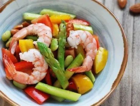 主料:蝦仁 蘆筍 彩椒 黃瓜 洋蔥 鹽 糖黑胡椒 料酒 橄欖油  米醋