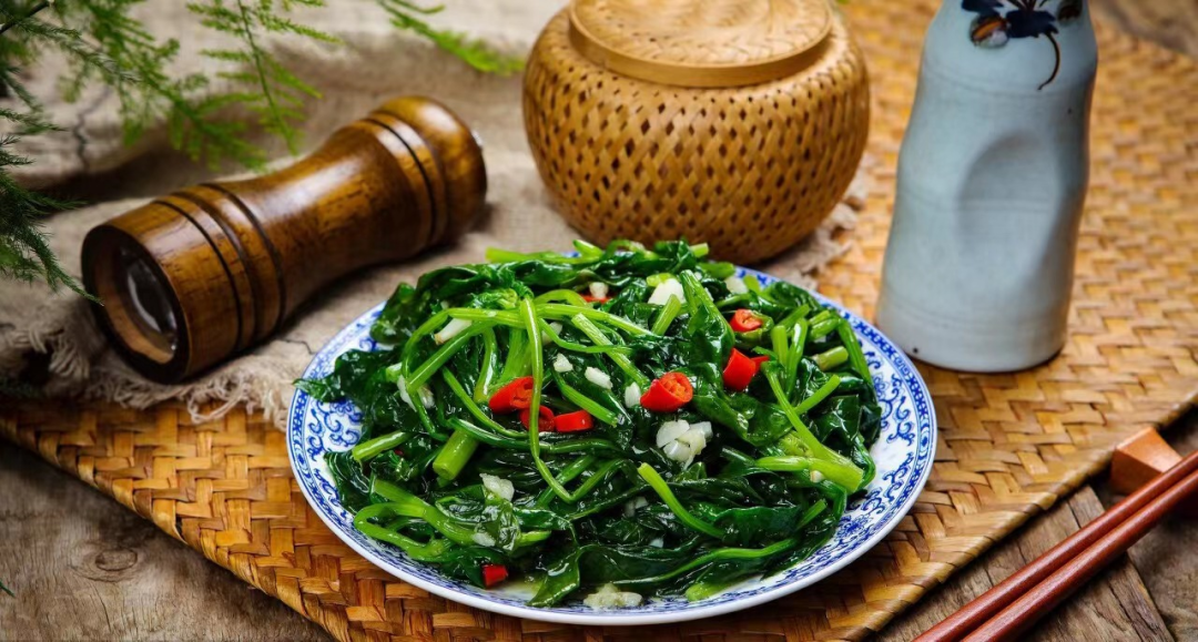 材料:菠菜、鹽、花椒、干辣椒、橄欖油