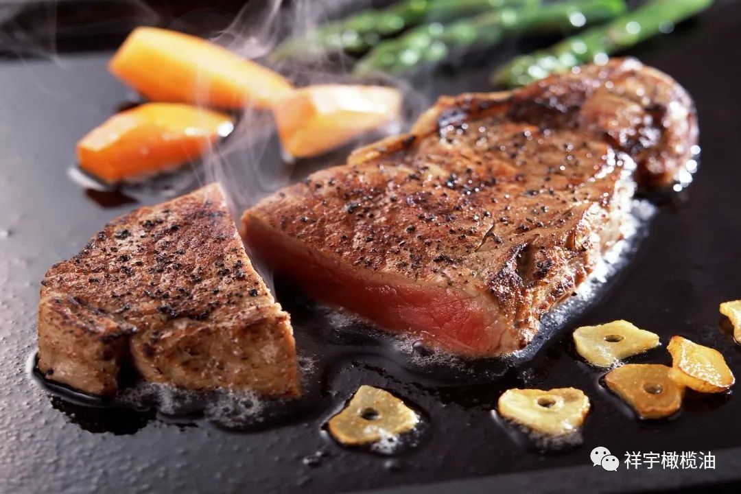 牛排上放一小塊黃油,煎2分鐘,這時(shí),上面的黃油基本化了