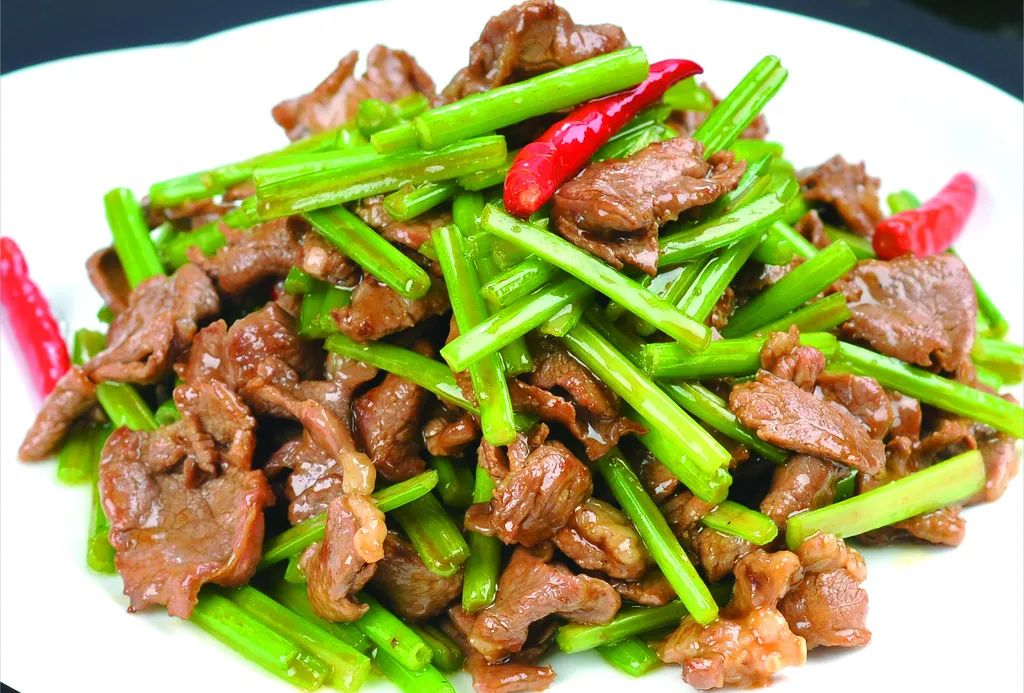 4、鍋里余油,下入芹菜、瘦肉翻炒均勻