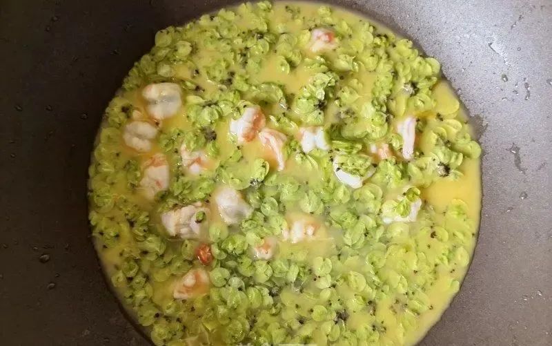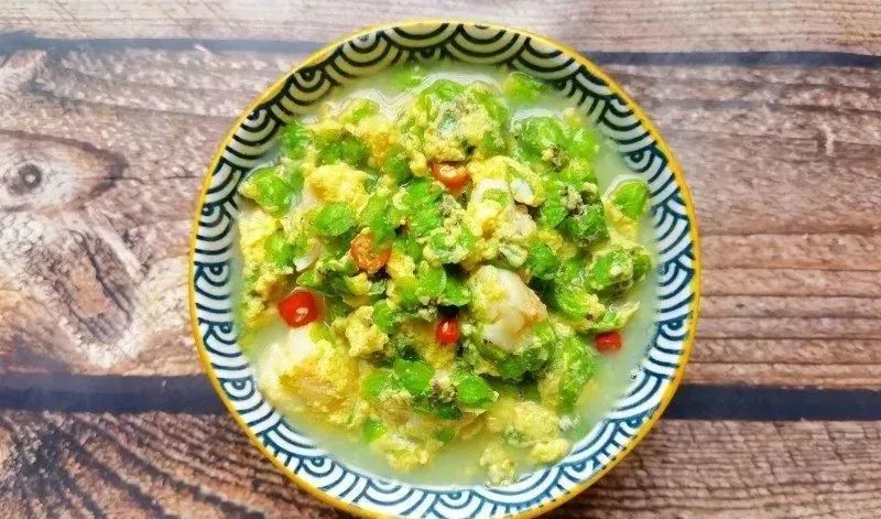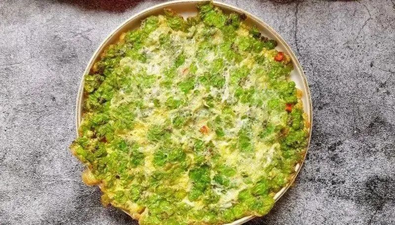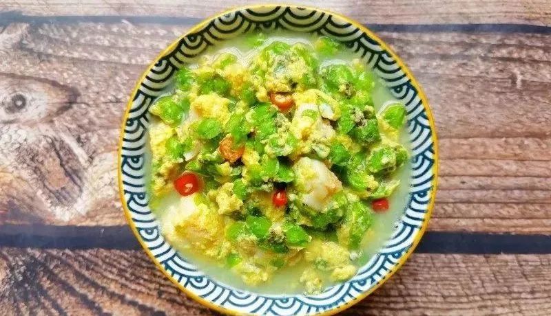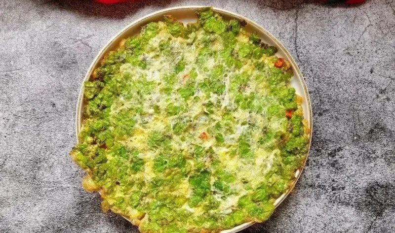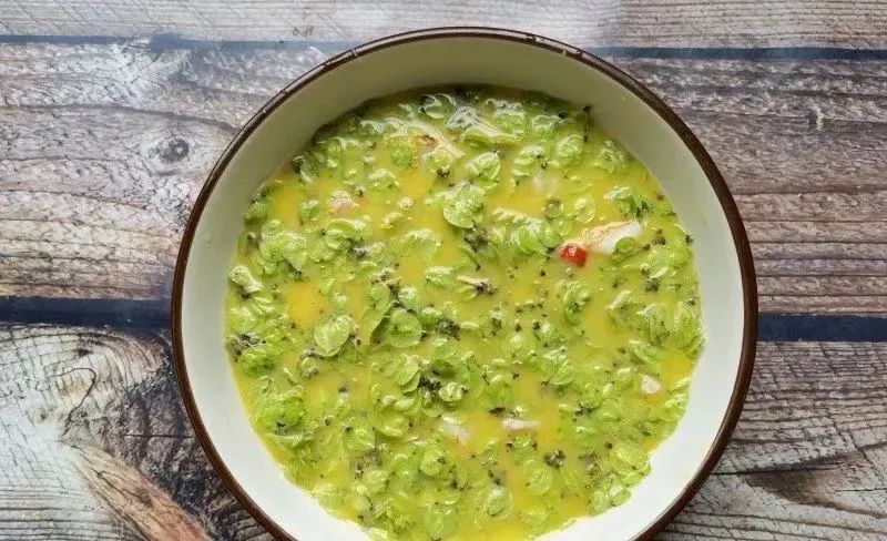 原料:榆錢、蝦仁、雞蛋、小米椒、鹽、橄欖油。