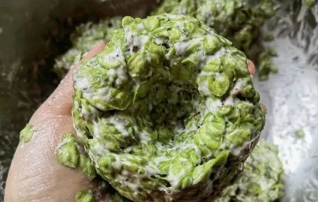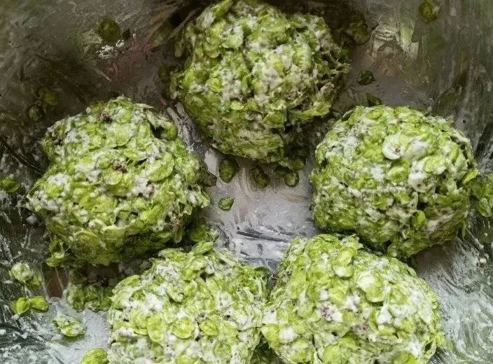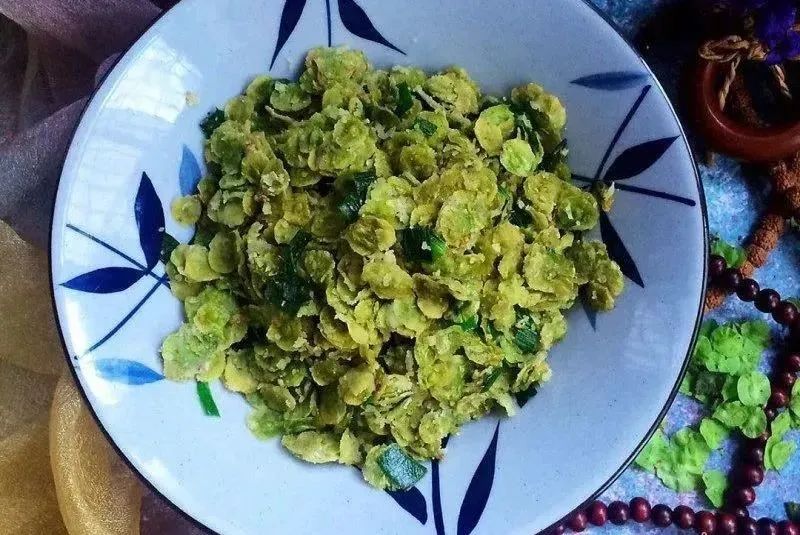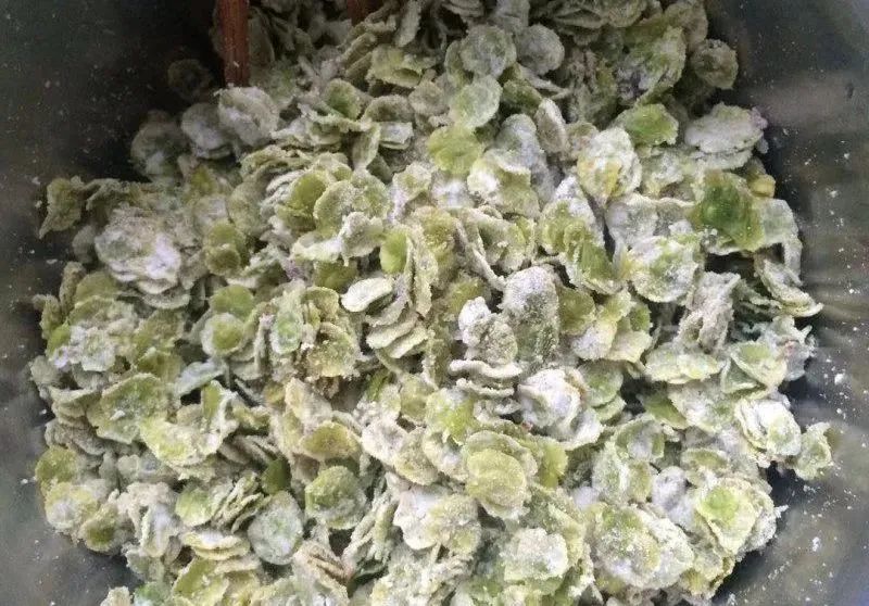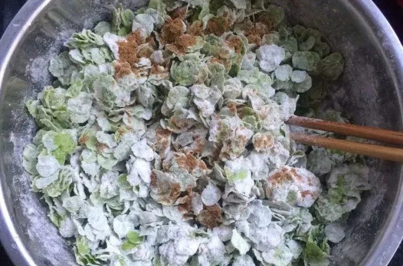 榆錢摘好洗凈,放入面粉,五香粉拌勻。