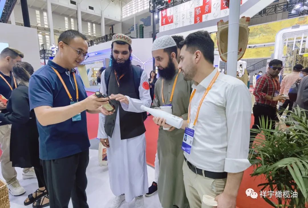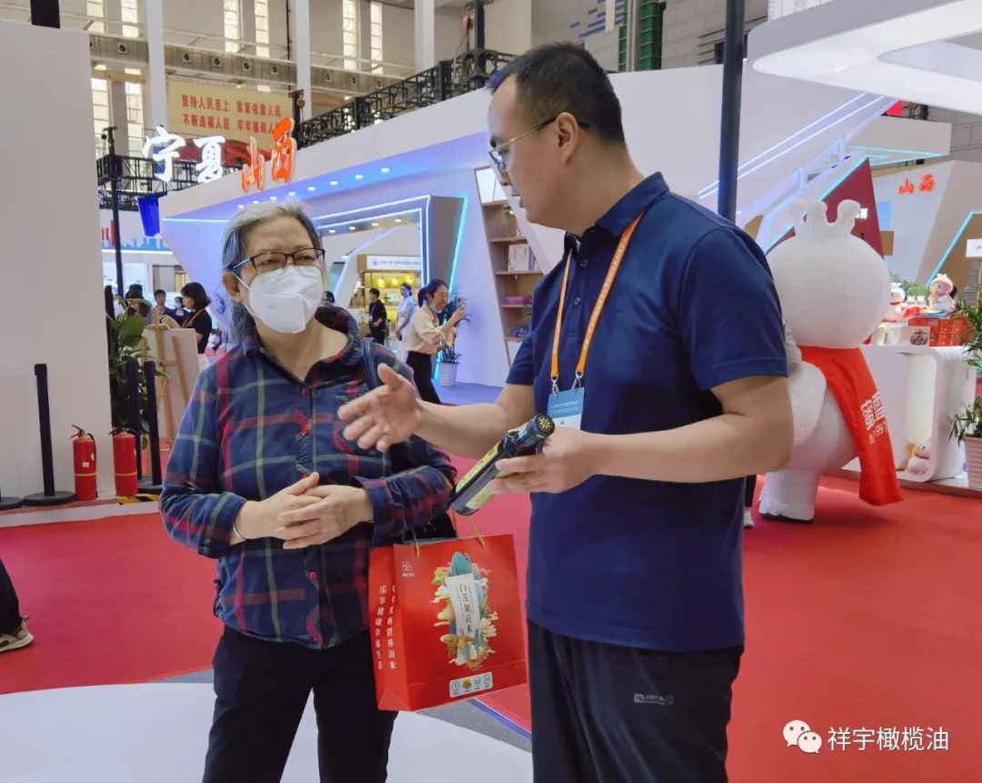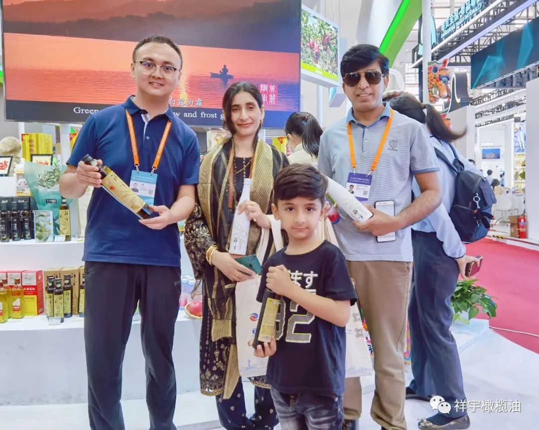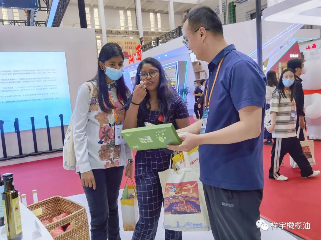 展會(huì)現(xiàn)場,來賓、客商紛紛到祥宇橄欖油展臺(tái)前駐足品鑒,