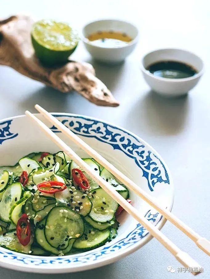 用黃瓜、辣椒、芝麻、橄欖油來(lái)調(diào)味中式沙拉。