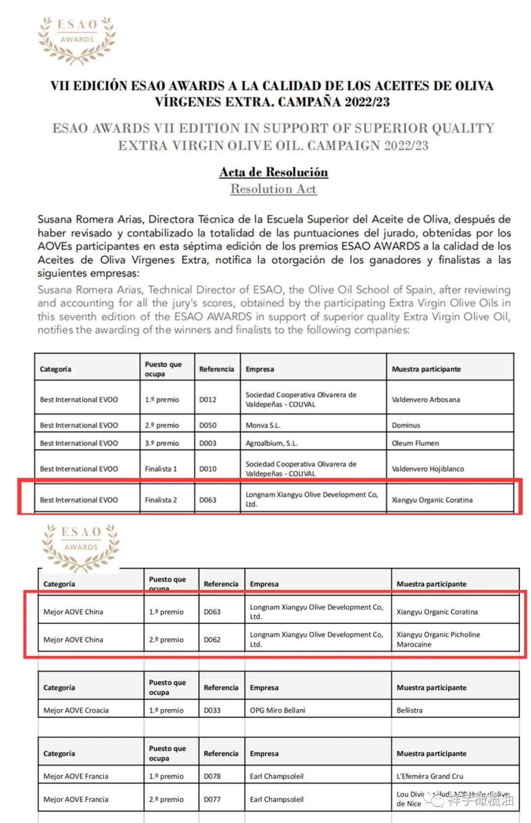 ESAO獎是由Escuela Superior del Aceite de Oliva