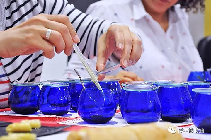 采用藍色郁金香型橄欖油品鑒專用杯。